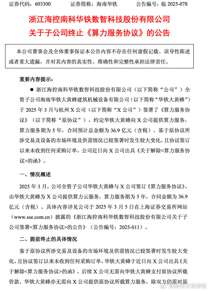 9月30日,海南华铁(证券代码:603300)发布公告称,其全资子公司海南华铁大黄蜂建筑机械设备有限公司与杭州某公司(公告中隐去具体名称,以“X公司”代称)于今年3月签署的《算力服务协议》已经终止。这份原本为期5年、总金额高达36.9亿元的合同,在喧嚣登场后悄然落幕。