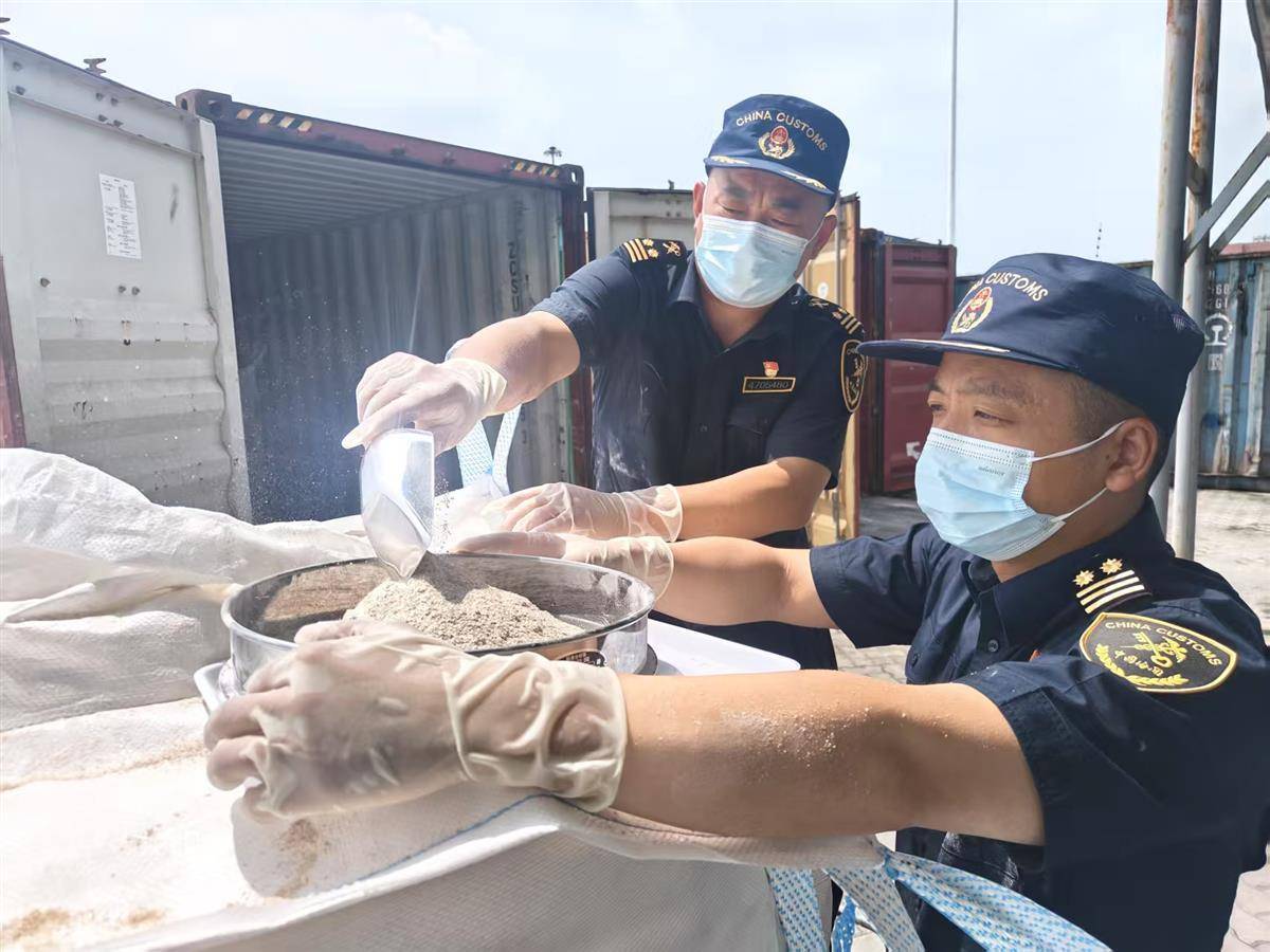 关员董伟、王非正在对中亚进口饲用小麦粉开展查验。陈宽卫摄